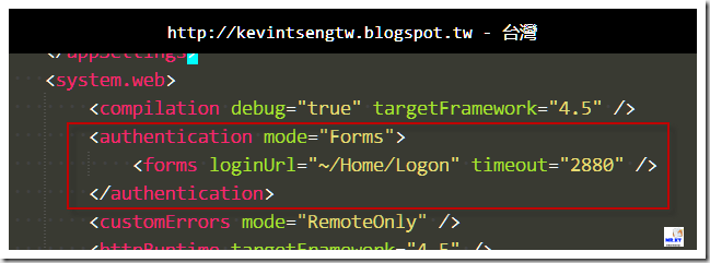 再來就是當未登入的使用者進入到系統時,要將使用者導向預設的登入頁,這裡我們在 Web.Config 的 System.Web 區段裡加入 Authentication 的設定,