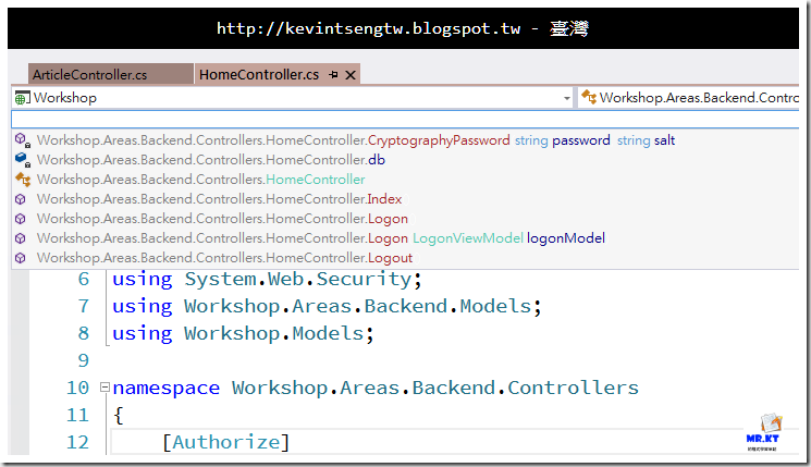 然後我移到 ArticleController.cs 項目上,按下 Enter 就開啟 ArticleController.cs 檔案,